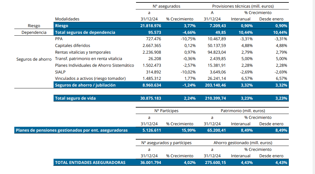 Al cierre de 2024 las aseguradoras gestionaban a través de seguros de Vida un total de 210.400 millones de euros, un 3,23% más que un año antes, según Unespa. Además, hay que añadir otros 65.200 millones de euros en patrimonio de los Planes de Pensiones gestionados por las aseguradoras, con un incremento del 8,49%. Supone que sector asegurador acumulaba 275.600 millones de euros al término del pasado ejercicio, un 4,43% más que el anterior.