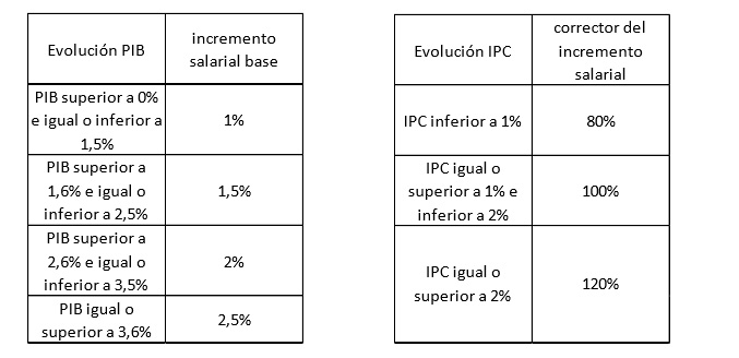 De esa forma el incremento salarial para 2016 será del 1,5% y para el periodo 2017-2019 habrá que ver cómo ha sido la evolución del IPC (marco referencia de sindicatos) y el PIB (elección preferida por Unespa). Con las previsiones de Bruselas, confirmadas ayer mismo, de un incremento del PIB del 2,3% y del 2,1% para los próximos 2 años el incremento salarial sería del 1,5%, según las tablas.
