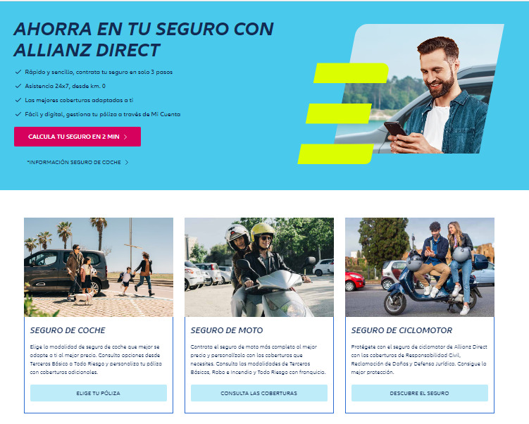 Allianz Direct España ha aprovechado esta renovación de la marca para rediseñar su web, implementando mejoras y nuevos componentes. Por tanto, este nuevo diseño ya está visible en la web, pero también en redes sociales y campañas digitales.