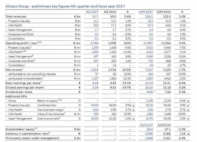 Los ingresos totales del Grupo Allianz en 2017 alcanzaron 126.100 millones de dólares, con un incremento del 3% y mejora en todas sus líneas de negocio. La compañía ganó 7.207 millones, lo que indica una caída del 1,7% respecto al año pasado con una caída por encima del 20% en el último trimestre del año. Por su parte, el beneficio operativo alcanzó los 11.097 millones mostrándose similar al pasado ejercicio. El ratio de Solvencia de la compañía se sitúa en el 229% mejorando en 10 puntos los anteriores datos.