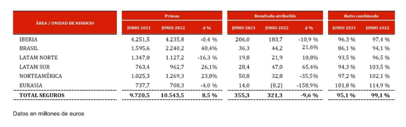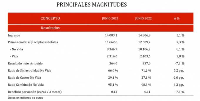 Los datos del grupo muestran un ratio de siniestralidad No Vida que ha crecido en 5,2 puntos porcentuales entre el pasado junio y el de 2021 hasta situarse en el 71,2%.