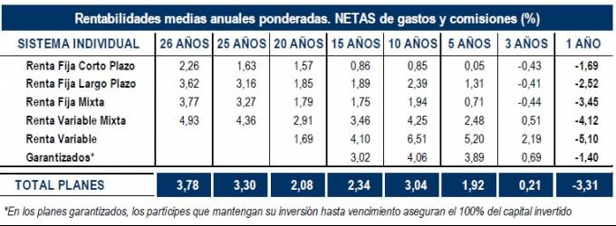 Más allá de estos datos en el largo plazo las rentabilidades siguen siendo positivas y la rentabilidad media ponderada anual se encuentra en el 3,78% con la Renta Variable Mixta con una rentabilidad de casi el 5%. En medio plazo los datos también son positivos: +1,92% en 5 años y mejoras del 3% en 10 años.