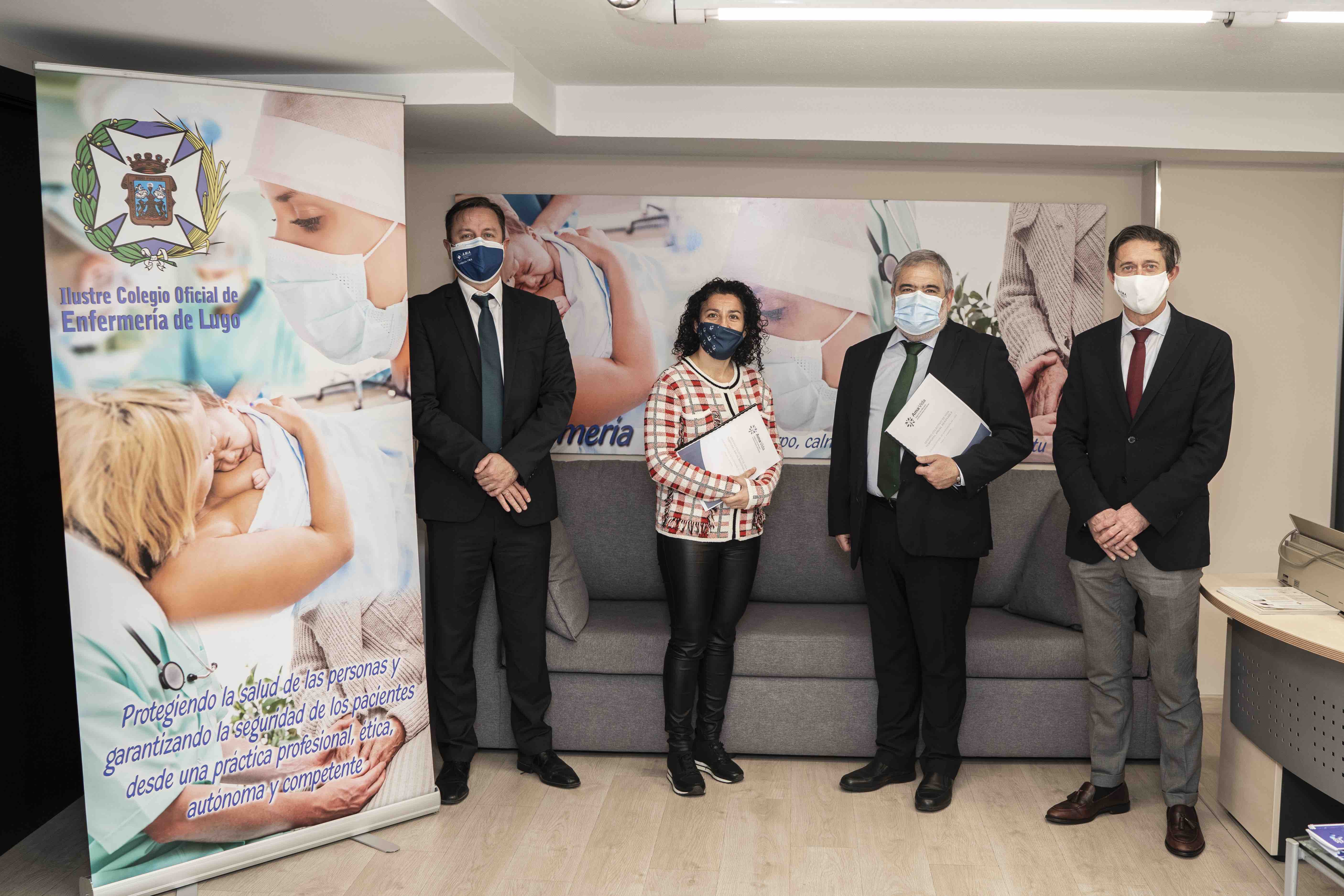AMA Vida ha alcanzado un acuerdo con el Colegio de Enfermería de Lugo para asegurar a sus colegiados con una póliza colectiva de Vida. La póliza se ha firmado en la sede colegial y, en representación de la aseguradora, han asistido Miguel Ángel Vázquez, director de colectivos de AMA Vida; Javier Sande, director territorial de la zona; y Carmelo Barreiros, delegado de A.M.A. en Lugo.