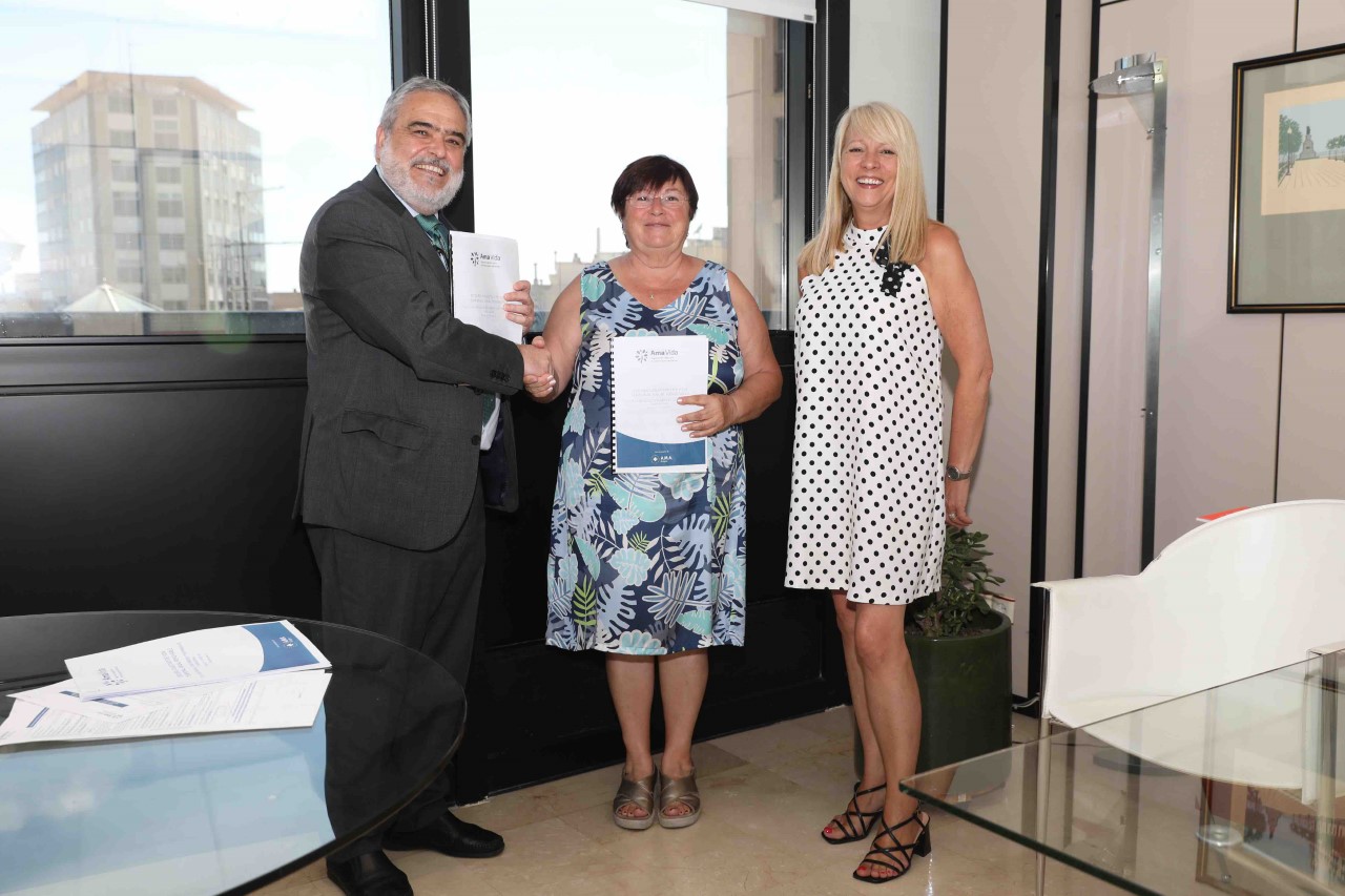 Lluïsa Brull, presidenta del Colegio, y el director de Colectivos Miguel Ángel Vázquez y la Delegada de A.M.A. en Tarragona Carmen Lamiel, representando al presidente de la entidad Diego Murillo, suscribieron la póliza que asegura un capital por fallecimiento a los beneficiarios de cada uno de los colegiados de este colectivo de enfermería.