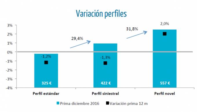 Definidos los perfiles, el estudio revela diferencias de hasta 232 euros, siendo la prima del conductor novel un 31,8% más elevada que la media y con un alza del 2% respecto a los precios de 2015.