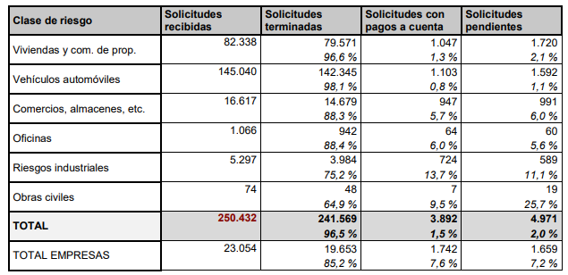A esta fecha, el CCS ha pagado 209.303 solicitudes, por un importe acumulado de 3.839,5 millones de euros, desglosados por clase de riesgo de la siguiente forma: Viviendas y comunidades de propietarios, 61.284 pagos por 1.062 millones de euros; Vehículos automóviles, 131.018 pagos por 1.183,9 millones de euros; Comercios, almacenes y otros riesgos, 12.402 pagos por 837,8 millones de euros; Oficinas, 800 pagos por 36,2 millones de euros; Riesgos industriales, 3.764 pagos por 701 millones de euros; Obras civiles, 35 pagos por 18,4 millones de euros.