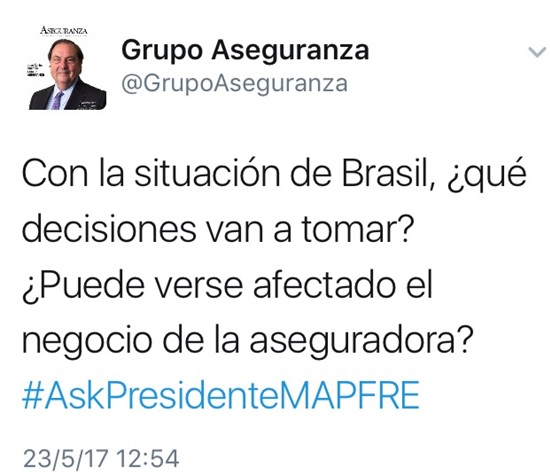 Desde la redacción de Aseguranza también se enviaron preguntas al presidente de Mapfre. Preguntado por la situación actual de la compañía en Brasil, Huertas reconoció que “Brasil es un gran país en el que llevamos más de 25 años”. Piensa que lo que está pasando es una pequeña etapa, una situación anómala que tendrá solución”. En este sentido transmitió tranquilidad. “Nosotros vamos a continuar con nuestros planes de expansión junto con nuestro socio y esperamos cosechar muchos éxitos en este país”.