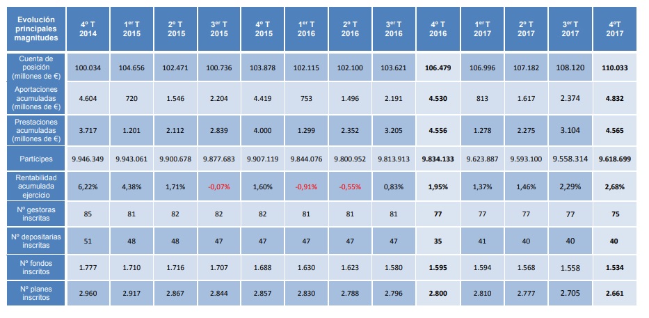 La DGSFP acaba de publicar el Boletín de Información Trimestral de Planes y Fondos de Pensiones correspondiente al 4º Trimestre de 2017 donde se destaca una evolución creciente de los Planes de Pensiones alcanzando los 110.033 millones de euros, la mayor del período de referencia y que supone un aumento de 3,34% respecto al mismo periodo del año anterior.