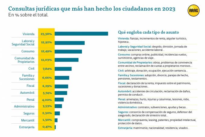 Desde hace cinco años se mantiene la tendencia y son las áreas de vivienda, laboral, consumo y comunidad de propietarios las que más dudas generan. Los datos de ARAG, que ha analizado las consultas recibidas por sus abogados en 2023, muestran que el mes con más consultas fue marzo (9,59% del total) y que más del 25% de las llamadas anuales fueron relacionadas con la vivienda. Todo ello en un año marcado por la entrada en vigor de la Ley de Vivienda que implica cambios como los nuevos límites de incrementos de alquileres o la definición de grandes tenedores.