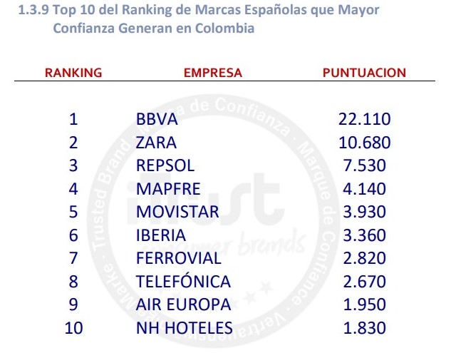 Y, del conjunto de aseguradoras españolas en Colombia, el estudio destaca a una de ellas. Se trata de Mapfre, que con 4.120 puntos, ocupa el 5º puesto del ranking de empresas españolas que mayor confianza genera en Colombia y escala a la 4ª posición en la clasificación de marcas españolas más valoradas. Ambos listados los lidera BBVA con 22.110 puntos.