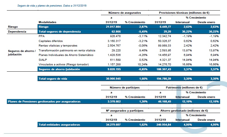 Las aseguradoras españolas cerraron 2019 gestionando un total de 240.955 millones de euros de sus clientes. Esta cifra es un 4,95% más que un año antes. Del total de la cantidad, 194.786 millones corresponden a productos de seguros (+3,35%), mientras que los restantes 46.169 millones forman parte del patrimonio de los Planes de Pensiones cuya gestión realiza el sector y que se han anotado un crecimiento del 12,1% en el último año.