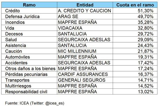 ICEA ha publicado los rankings definitivos de 2017, en los que se muestran los grupos y entidades líderes en cada ramo en volumen de primas. En el caso de las entidades, los líderes en cada ramo son: Crédito y Caución (ramo de Crédito); ARAG SE (Defensa Jurídica); Mapfre España (Incendios); VidaCaixa (Vida); santalucía (Decesos); SegurCaixa Adeslas (Salud); santalucía (Asistencia); MIC Millennium (Caución); Mapfre España (Autos); SegurCaixa Adeslas (Accidentes); Otros Daños a los Bienes (Mapfre España); Pérdidas Pecuniarias (Cardif Assurances); Transportes (Generali Seguros); Multirriesgos (Mapfre España); RC (Mapfre España).