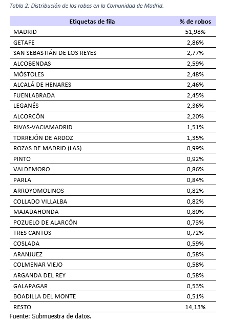 En general, un 52% de los robos ocurrieron en Madrid capital, seguido de Getafe y San Sebastián de los Reyes con el 2,86% y 2,77%, respectivamente. Si atendemos a los datos únicamente de la capital los barrios con más frecuencia ocurrieron en Carabanchel, Hortaleza, Fuencarral y Usera. Mientras tanto, los más graves -entendida la relación entre el coste del robo y el valor de los bienes asegurados- se produjeron en Los Cármenes y Aluche, en Latina y en zonas de Ciudad Lineal como Ventas y Pueblo Nuevo.