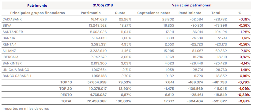 En total, los 10 principales grupos financieros acaparaban en mayo el 79,53% del patrimonio. Entre ellos, solo hay una aseguradora, Allianz, en el sexto puesto con 3.234 millones. Por delante de ella: CaixaBank, BBVA, Santander, Bankia y Renta 4.