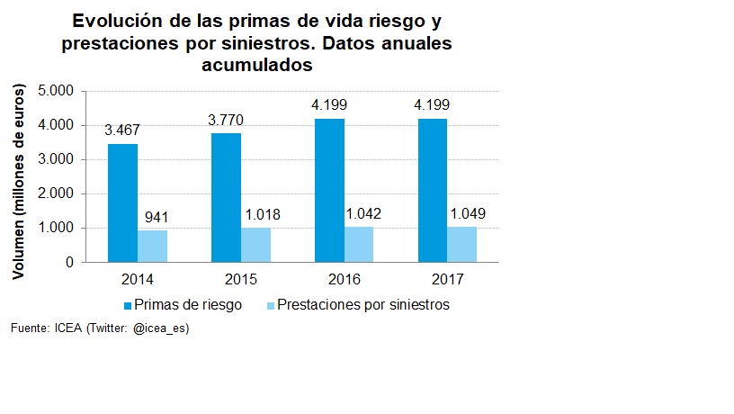 Las primas de seguros de Vida Riesgo han alcanzado los 4.199 millones de euros a diciembre de 2017, prácticamente la misma cifra que el año anterior, con un avance mínimo del 0,04%. Las prestaciones por siniestros sumaron 1.049 millones, una cifra también muy similar a la de 2016 (1.042 millones). Por su parte, los asegurados crecieron un 2,03%, situándose en 20,1 millones.
