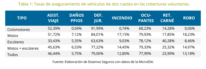 Hablando también de aseguramiento, más allá del obligatorio, las coberturas de asistencia, defensa jurídica y ocupantes son las que mayor nivel de contratación reflejan. También destaca el subsidio por pérdida de carné de conducir, lo que según el informe, es una cobertura que "pone de manifiesto la interacción de personas que usan el vehículo de dos ruedas como instrumento de trabajo".