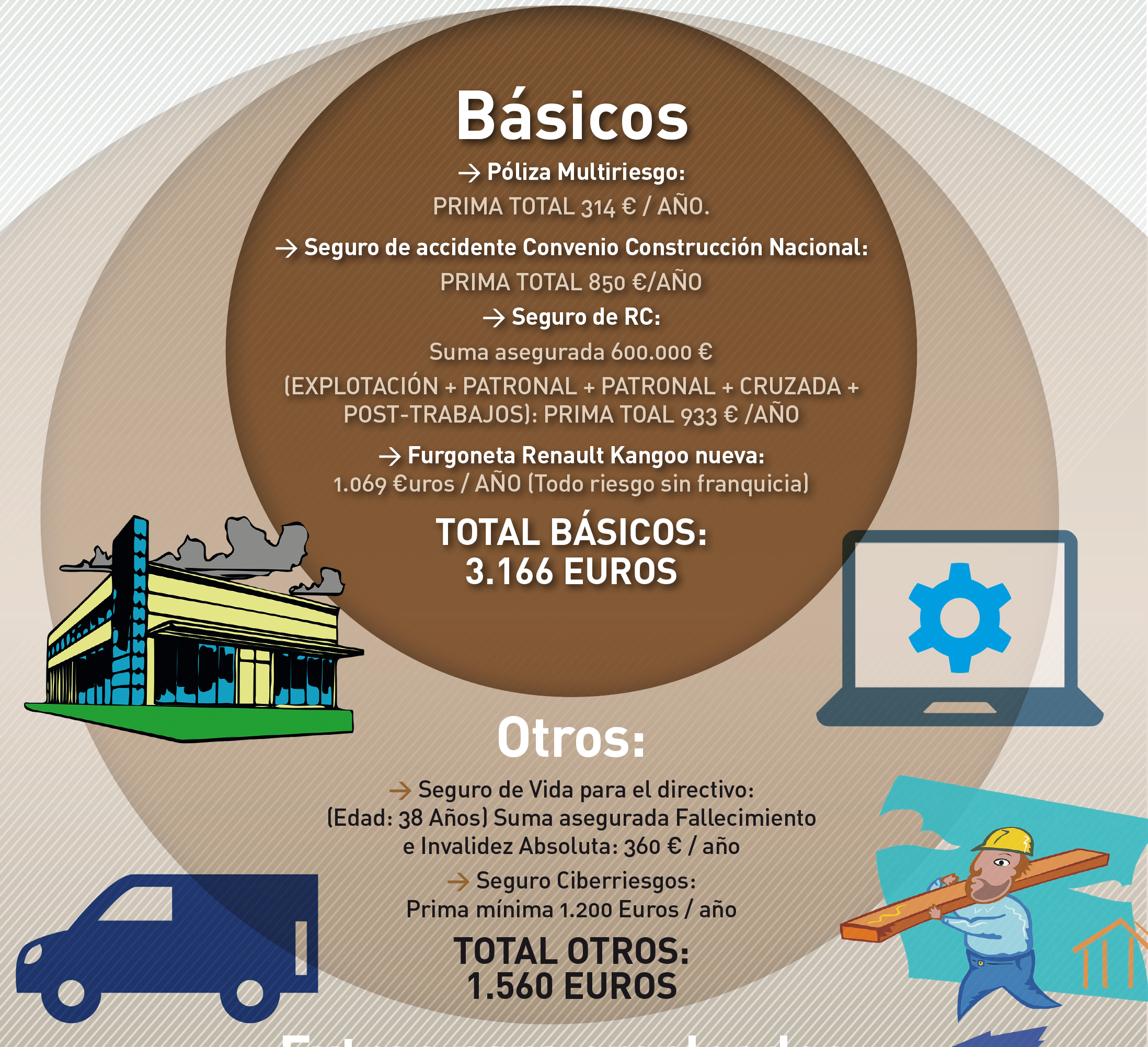 Eso sí, para "vivir con tranquilidad" y no poner en riesgo el negocio, se aconseja contar con un seguro Multirriesgo; el seguro de Convenio obligatorio si la actividad que desarrolla lo exige; seguro de RC que incluya la RC de Explotación que cubre los daños ocasionados a terceros durante el desarrollo del trabajo; la RC Patronal que protege ante un accidente que pueda sufrir un trabajador y que derive en un juicio; la RC Cruzada, que es similar a la anterior pero para casos de subcontratas; la RC Post-trabajo, que cubre durante 6, 12 ó 24 meses cualquier accidente una vez que la empresa constructora ya ha salido de la obra; y algunas otras como la RC de Técnicos en Plantilla, que es necesaria contratar para trabajar con la administración pública; y un Todo Riesgo para el vehículo de empresa.