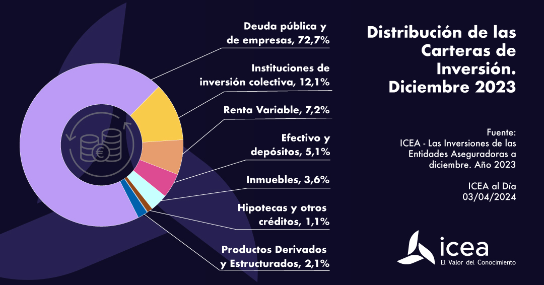 A gran distancia se encuentran las Instituciones de Inversión Colectiva, con un 12,1%. Otros componentes relevantes de la cartera de inversiones del sector son la renta variable (7,2%) y el efectivo y depósitos (5,1%).