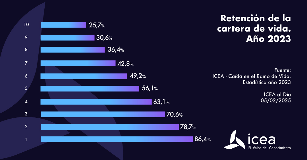 Los datos de ICEA muestran que en el caso de los seguros de Vida individuales, a finales de 2023 se mantuvieron en cartera el 86,4% de las pólizas existentes un año antes. "Si estimamos el porcentaje de retención sobre las pólizas existentes a finales de los años anteriores, observamos que al cabo de 10 años, se mantendrían el 25,7% de las mismas", añade.