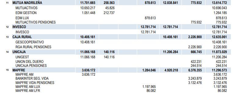 Un escalón por debajo se mantienen Allianz, que se sitúa en la 38ª posición con 4.389 millones de activos gestionados, gran parte en IIC (4.044 millones); Santalucía, en la 40ª plaza con 4.311 millones (1.241 millones en IIC y 3.070 millones en Fondos de Pensiones); GCO, en el 51º puesto con 1.729 millones, la mayoría en IIC (1.053 millones); y Caser, asentado en la 53ª posición con 1.598 millones, todo en Fondos de Pensiones.