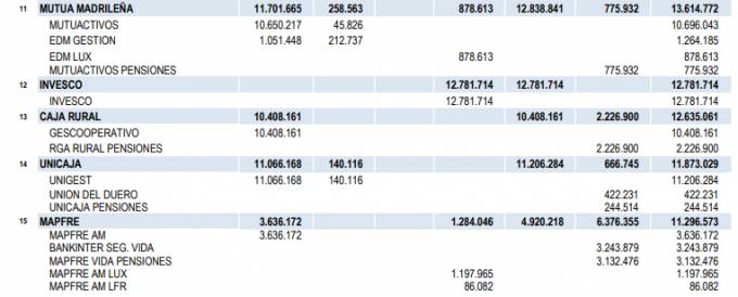 En este ranking, formado por 102 entidades, hay 13 grupos aseguradores. De ellos, 3 están en el 'top-25': Mutua Madrileña, que ocupa el 11º puesto con 13.614 millones de euros en activos gestionados, casi todo en IIC (12.838 millones); Mapfre, en 15ª posición con 11.296 millones de euros bajo gestión, de los que 4.920 millones están en IIC y 6.376 millones en Fondos de Pensiones; y AXA, que cierra el 'top-25' con 6.846 millones de euros gestionados, de los que 5.790 millones están en IIC y 1.056 millones en Fondos de Pensiones.