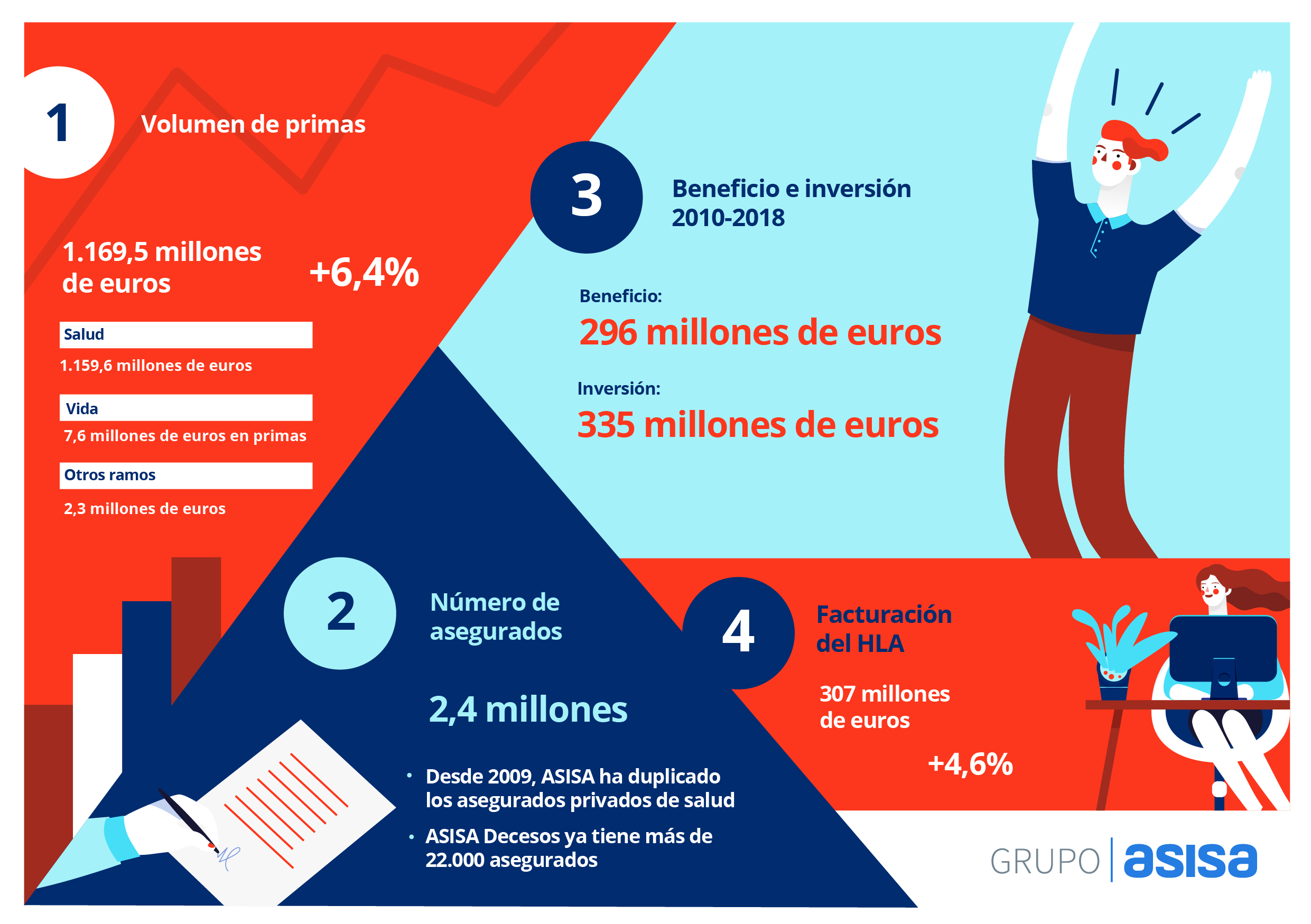 Grupo Asisa cerró el año 2018 con un crecimiento en primas de un 6,4% respecto al año anterior, alcanzando los 1.169 millones de euros. "Este crecimiento ha permitido al Grupo consolidar su actividad aseguradora multirramo, avanzar en el desarrollo y diversificación de su red asistencial propia y fortalecer su presencia internacional, tres de los ejes estratégicos de la compañía", señala la compañía en nota de prensa.