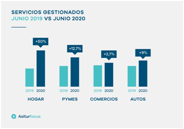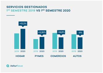 Si se comparan los datos del primer semestre de este 2020 con los de 2019 se aprecia que los servicios de hogar y pymes han crecido de manera interanual más del 12% y del 3%, respectivamente, mientras que los de comercios caen un 15% y la asistencia en carretera se ha disminuido un 9%.