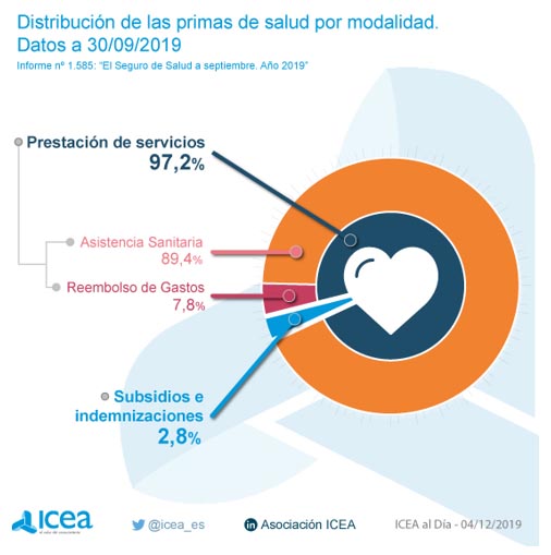 En cuanto a la distribución de primas por modalidades, el 97,4% están referidas a prestación de servicios (97,2%) y dentro de ella principalmente a Asistencia Sanitaria con más del 89% de las primas.