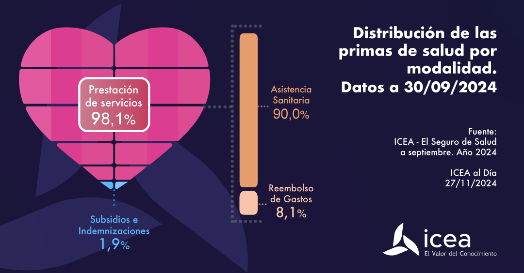 Ya publicó Unespa que el seguro de Salud cerró el tercer trimestre de 2024 con un crecimiento en primas del 7,7%. Ahora, ICEA ha ofrecido más datos. Por ejemplo, que la recaudación se ha elevado hasta los 9.132 millones de euros, de los que Prestación de Servicios ha aportado el 98,1%, exactamente igual que en el trimestre anterior. Y este 98,1% se desglosa así: el 90% procede de Asistencia Sanitaria y el 8,1% restante, a Reembolso de Gastos. Por su parte, Subsidios e Indemnizaciones aporta el 1,9%, igual que tres meses atrás.