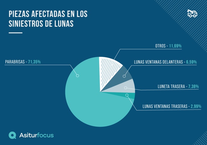Según el estudio, el parabrisas delantero es la pieza que genera más siniestros de lunas, suponiendo un 71,35% del total, seguido de la luneta trasera, con un 7,38%, y las lunas de las puertas delanteras y traseras, que representan un 6,59% y un 2,99% del total respectivamente. El restante 11,69% se reparte entre otros tipos de piezas como las lunas de custodia (cristales triangulares laterales) y los techos solares.