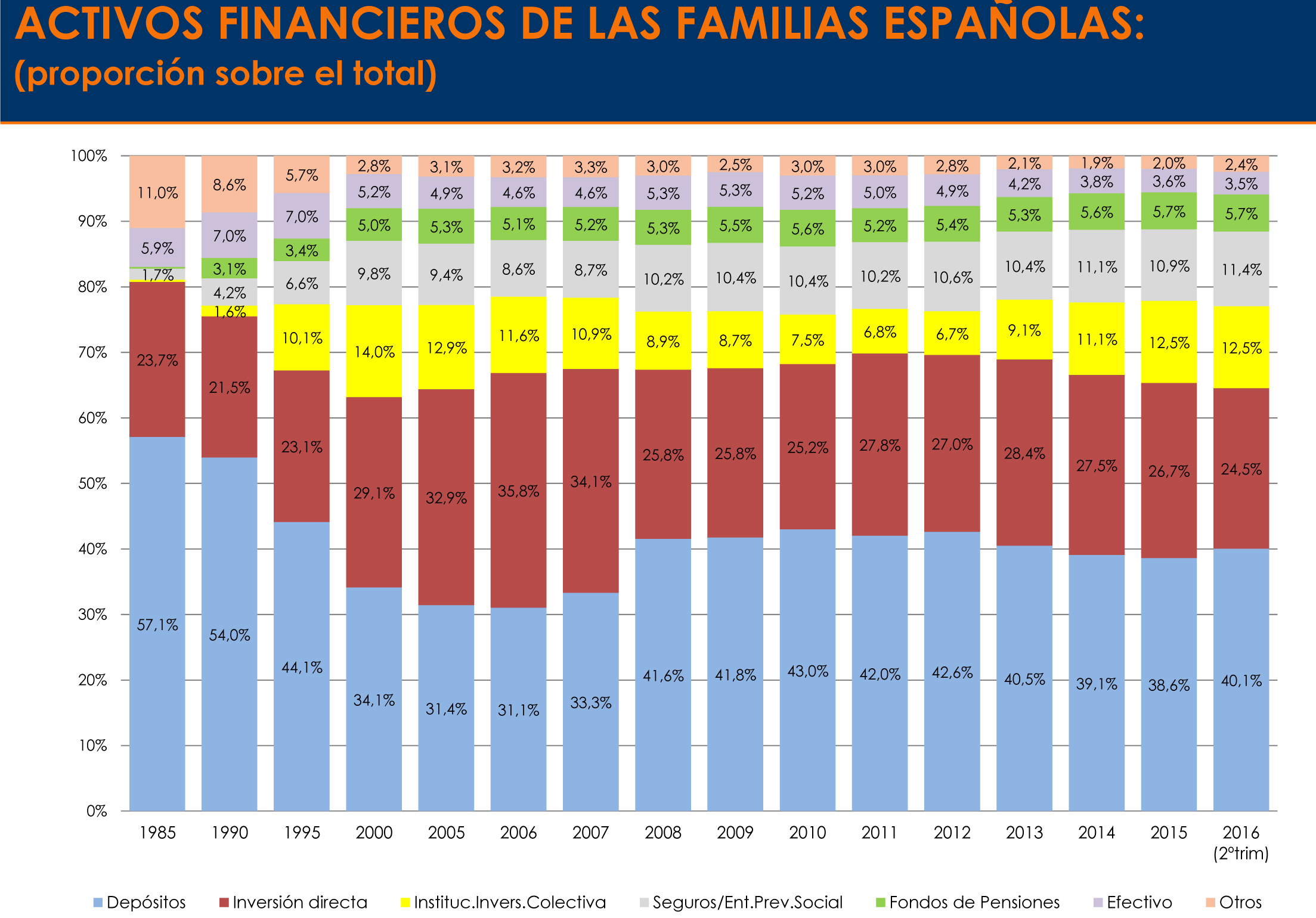 La riqueza financiera de los hogares (activos menos pasivos) retrocede ligeramente en la primera mitad de 2016 y se sitúa en 1,2 billones de euros. En términos porcentuales sobre PIB, la riqueza financiera de las familias españolas alcanza el 108,8%, frente al 65,0% en diciembre 2008. Por su parte, la riqueza total de los hogares (financiera más inmobiliaria) se situó en el 521% de PIB en marzo 2016 (último dato disponible) frente al 685% de junio de 2007 (máximo histórico). Durante este período, las familias españolas han incrementado su riqueza financiera en 16 puntos porcentuales de PIB, mientras que su riqueza inmobiliaria ha experimentado una drástica reducción de 180 puntos porcentuales de PIB (1,7 billones de euros de pérdida de valor de sus propiedades inmobiliarias).