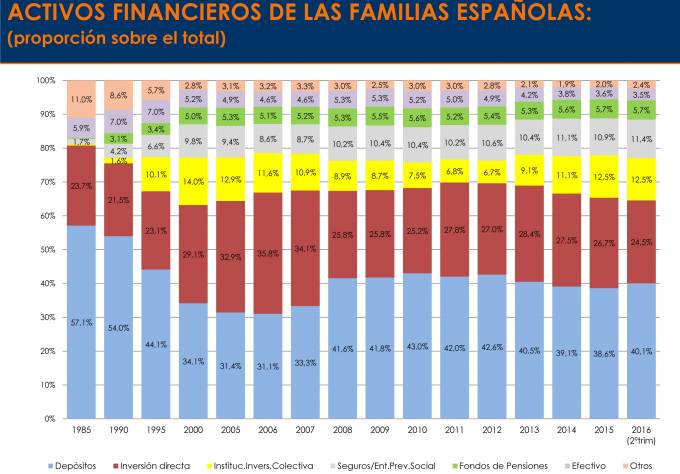 El ahorro financiero (activos financieros) acumulado por las familias españolas a finales de junio 2016, se situó en 1,980 billones de euros, según datos del Banco de España, lo que supone una reducción del 1,5% en el primer semestre del año (29.135 millones de euros). Según explica Inverco, el impulso de la inversión neta en activos financieros realizada por las familias ha sido insuficiente para compensar la pérdida de valor de las carteras de los hogares tras un semestre de ajustes en los mercados financieros.