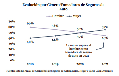 El estudio Anual de Abandonos del Sector de los Seguros en 2021 que realiza Gain Dynamics apunta un mayor número de mujeres tomadoras de seguros. Según estos datos, las mujeres suponen ya el 55,3% de quienes poseen un seguro de Autos, lo que muestran un crecimiento respecto a los datos de 2018 cuando sólo el 40,2% de estos seguros contaban a una mujer como tomadora.