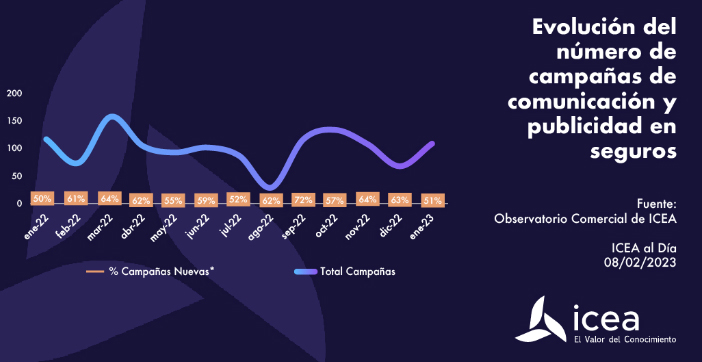 Las acciones de comunicación y publicidad dentro del sector asegurador han repuntado al inicio de este año, según el informe 'Observatorio Comercial' realizado por ICEA. Se mantiene en líneas generales con enero de 2022 donde la mitad de esta campaña fueron nuevos lanzamientos.