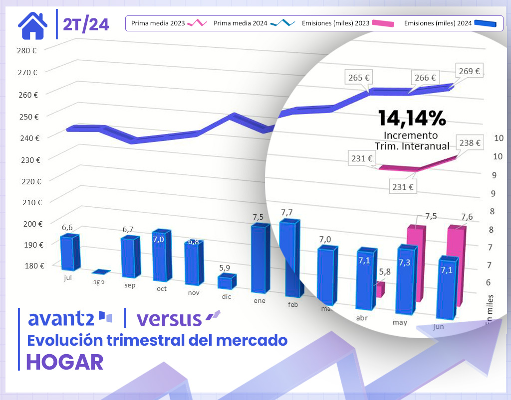 El seguro de Hogar cierra el trimestre, su prima media situada en 267 euros con un incremento del 14,14% a nivel interanual. A diferencia del seguro de Autos, Hogar no presenta aún un decrecimiento en la evolución interanual, alcanzando en este trimestre el valor máximo de subida interanual.