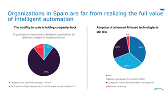 Según el informe la mayor parte de las compañías (36%) centra su estrategia de automatización inteligente en la robotización automatizada (RPA) y el procesamiento del lenguaje natural (PLN) con el 33%.