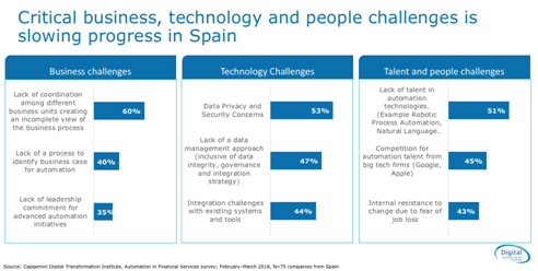 Más en detalle, el grado de adaptación de las empresas españolas de servicios financieros que ya han realizado su primera implantación alcanza el 79%. En concreto, el 28% de las entidades analizadas están trabajando en piloto o de forma generalizada con tecnologías de automatización cognitiva como la visión artificial y la biometría. Únicamente el 3% ha introducido tecnologías relacionadas con el machine learning.