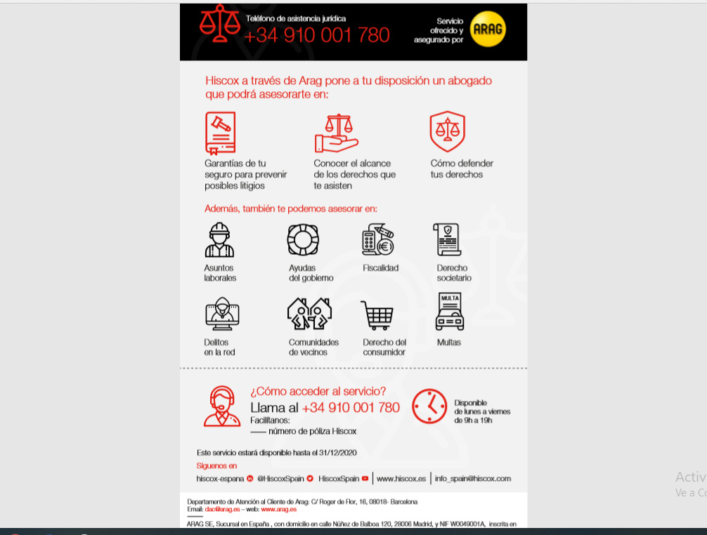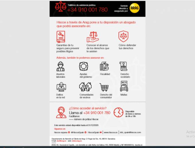 Cualquier asegurado interesado en tener acceso a este servicio, podrá solicitarlo directamente a través del número de teléfono de ARAG que Hiscox ha puesto a su disposición, el cual proporcionará contacto directo con un equipo de abogados.