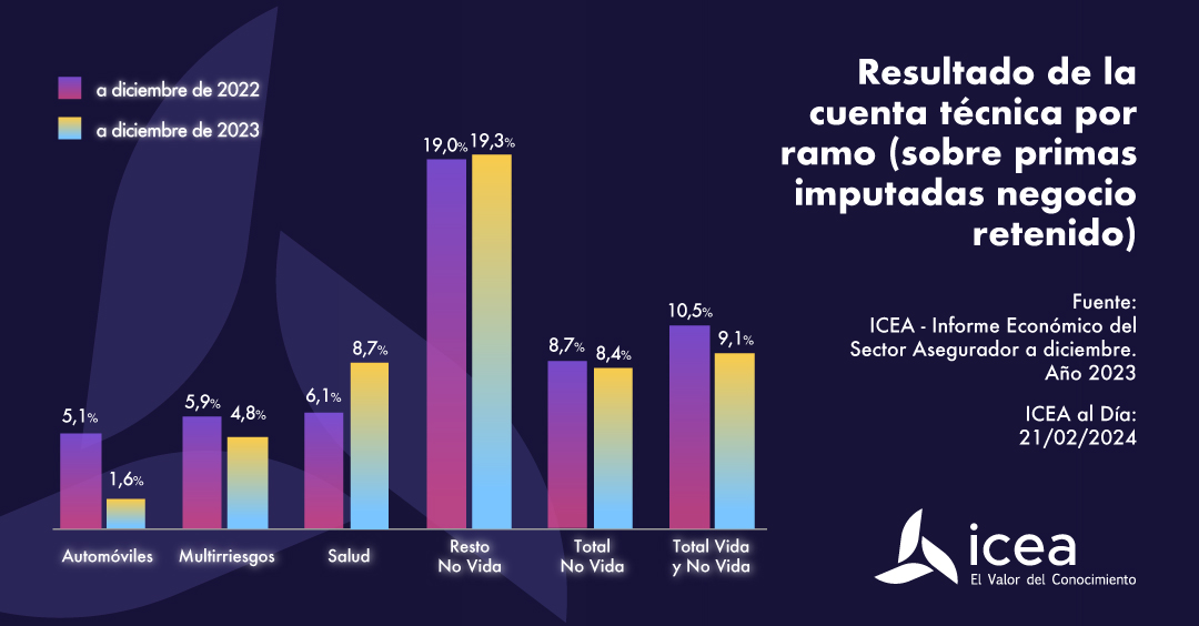 Si nos centramos en la cuenta técnica, el componente puramente asegurador, el resultado de la cuenta técnica del seguro expresado en base a las primas imputadas retenidas fue del 9,1%, un 1,4 p.p menos que un año antes. Como ocurría con el beneficio, Autos y Multirriesgo lastran el segmento No Vida cuya cuenta técnica se coloca en el 8,4% frente al 8,7% de un año antes.