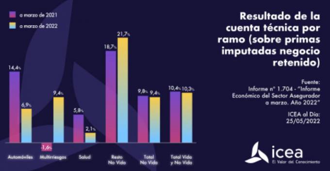 El resultado de Autos pasó del 14,4% de las primas en marzo de 2021 al 6,9% del último marzo. Esto significa que el resultado de la cuenta técnica menguó en 7,5 puntos porcentuales. Algo parecido también pasó en Salud; en el primer trimestre de este año la cuenta técnica ha empeorado en casi 4 puntos al pasar del 5,8% de un año antes al 2,1% con el que cerró los 3 primeros meses del año.