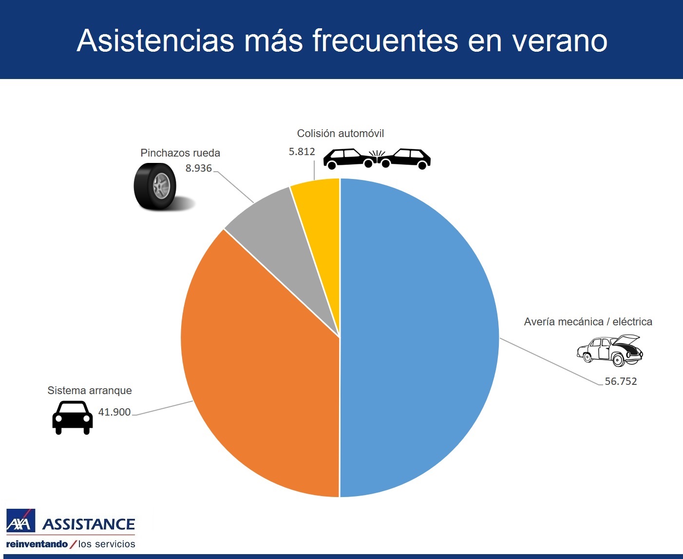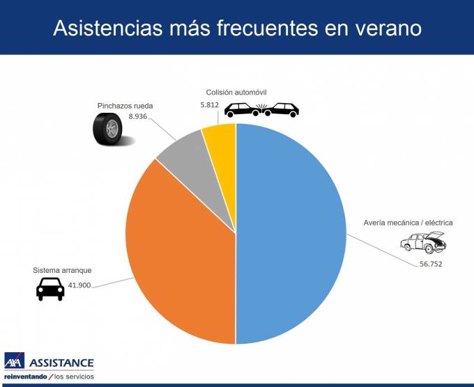 Las averías mecánicas y eléctricas son las asistencias más frecuentes durante las vacaciones de verano. Los datos de AXA Assistance sobre su cartera en julio y agosto del año pasado se realizaron más de 50.000 asistencias en carretera por fallos mecánicos y/o eléctricos. Es la incidencia más común en la carretera durante los meses de julio y agosto, seguida de los problemas en el arranque (41.900 casos), los pinchazos de rueda (8.936) y las colisiones (más de 5.000 accidentes).