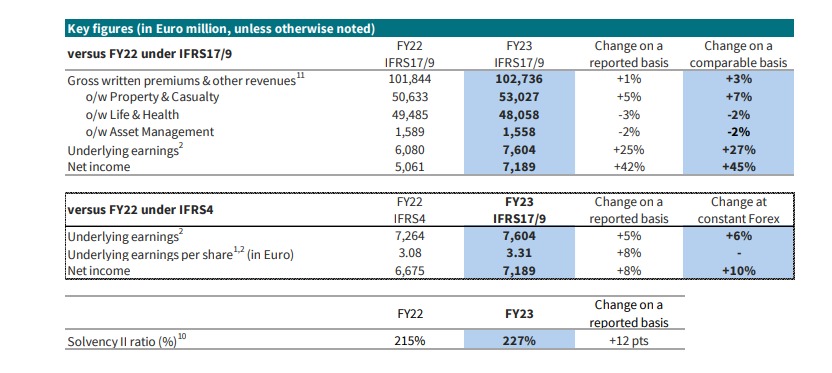 Thomas Buberl también ha repasado los resultados de 2023 de la aseguradora. "AXA registró resultados sólidos en 2023, lo que refleja la continuación de nuestra estrategia", ha señalado. El Grupo alcanzó con sus principales objetivos financieros con un crecimiento del 9% en su beneficio operativo por acción, un aumento acumulado de efectivo hasta 16.400 millones de euros y una rentabilidad operativa sobre el capital del 14,9%9, todo ello manteniendo la solidez de su ratio de solvencia II10. al 227%. "En 2023, nuestro buen impulso de crecimiento continuó en nuestras principales líneas de negocio, incluidos seguros de Hogar y Accidentes personales y comerciales, protección, productos de ahorro con bajo consumo de capital y Salud"