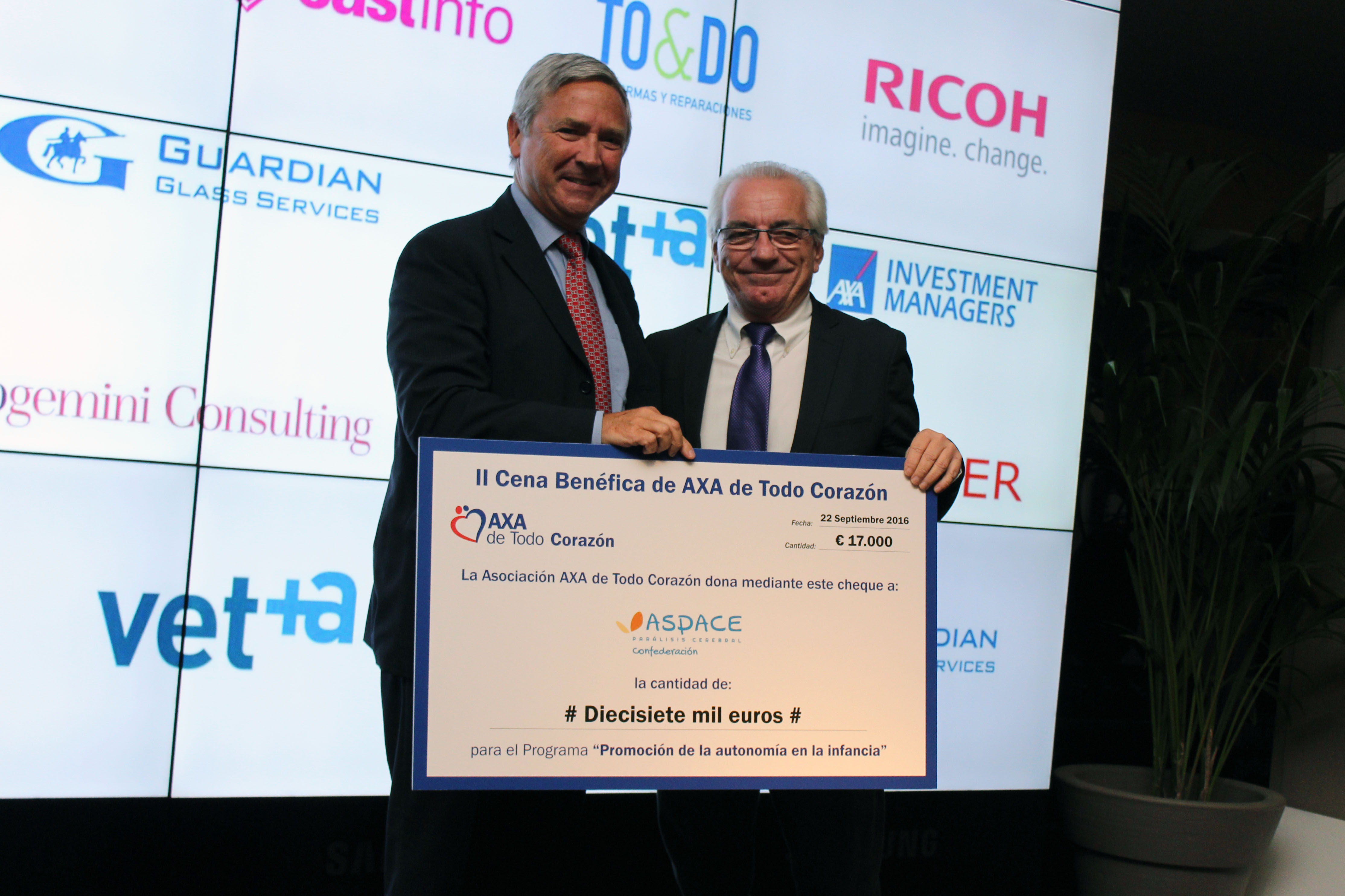 AXA de Todo Corazón ha celebrado sus 20 años con una cena benéfica. La recaudación hará posible un programa de la Confederación Española de Asociaciones de Atención a las Personas con Parálisis Cerebral (Aspace) para fomentar la autonomía de los niños con parálisis cerebral. Jean Paul Rignault, consejero delegado de AXA y presidente de la organización en España, agradeció el compromiso de los cientos de voluntarios, empleados y familiares de la aseguradora, de las empresas colaboradoras y las decenas de asociaciones con las que “hemos podido hacer realidad nuestra vocación, la protección”.