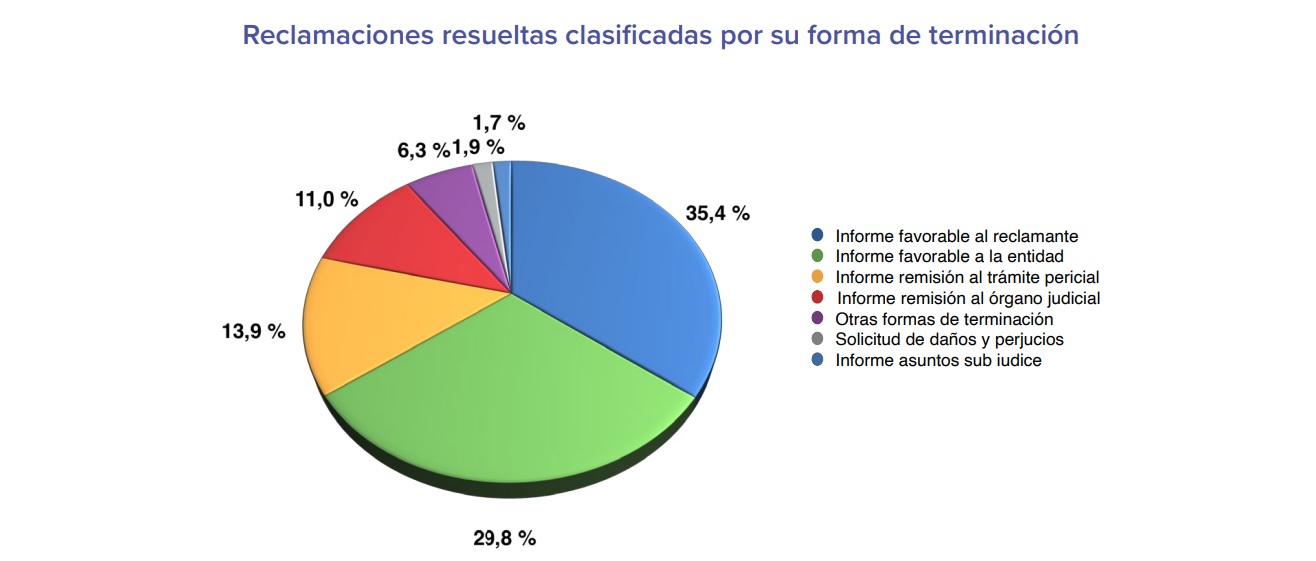 En cuanto al sentido de los informes con los que finalizan los expedientes de reclamación, un 35,4% terminó con un informe favorable al reclamante, un 29,8% finalizó con un informe favorable a la entidad y en el restante 34,8% el Servicio de Reclamaciones no pudo emitir, a la vista de las circunstancias planteadas, un pronunciamiento expreso que estimara o desestimara la pretensión del interesado.