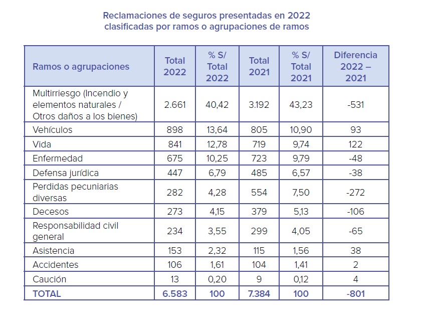 En un análisis por ramos, Multirriesgos es el ramo que acapara más reclamaciones con un 40,42% del total. Con todo, y a pesar de haber recibido 2.661 reclamaciones son 531 menos que el año anterior. Le siguen las reclamaciones en Autos y en Vida, ambos con un incremento en el número de reclamaciones presentadas.