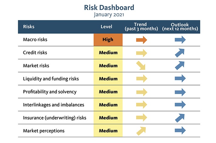 La exposición de las aseguradoras europeas a los riesgos macroeconómicos disminuyó de un nivel muy alto a uno alto, mientras que todas las demás categorías de riesgo se mantienen en un nivel medio. Para los próximos 12 meses, los supervisores europeos esperan un aumento en los riesgos crediticios, de mercado y de suscripción debido al impacto de las nuevas restricciones provocadas por la pandemia y a las consecuencias de la retirada de las ayudas. Así lo indica Eiopa, que publicó su Panel de Riesgos basado en los datos del tercer trimestre de 2020 de Solvencia II.