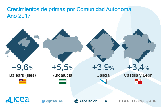 Las Comunidades Autónomas que registraron en 2017 los mayores crecimientos en primas de volumen de negocio fueron Baleares (+9,6%), Andalucía (+5,5%), Castilla y León (+3,9%) y Galicia (+3,4%), según los datos de ICEA. Las Comunidades con mayor volumen de primas siguen siendo Cataluña, Comunidad de Madrid, Andalucía, Comunidad Valenciana y Castilla y León.
