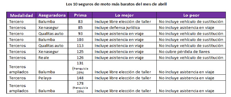 Según el comparador Kelisto en el mes de abril Balumba y Xenasegur ofrecen los seguros de moto más económicos con unas primas que oscilan entre los 83 y 85 euros al año. Qualitas Auto, con una prima de 93 euros, ofrece la mejor relación calidad-precio ya que entre las coberturas cuenta con asistencia en carretera. El bajo precio del seguro es uno de los factores a tener en cuenta antes de comprar una moto junto con el precio del vehículo.