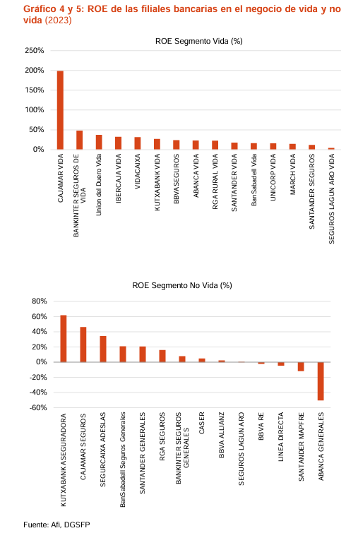 Este hecho ha provocado que el ROE promedio de las filiales aseguradoras de los bancos alcanzaron el 21,1% en 2023 amparado por "unos niveles de capital de las filiales bancarias, en general más ajustados que el resto de las entidades". Incluso para las compañías que operan en Vida se dispara al 25,1%, mientras que las de No Vida ofrecen un ROE del 13,2%.