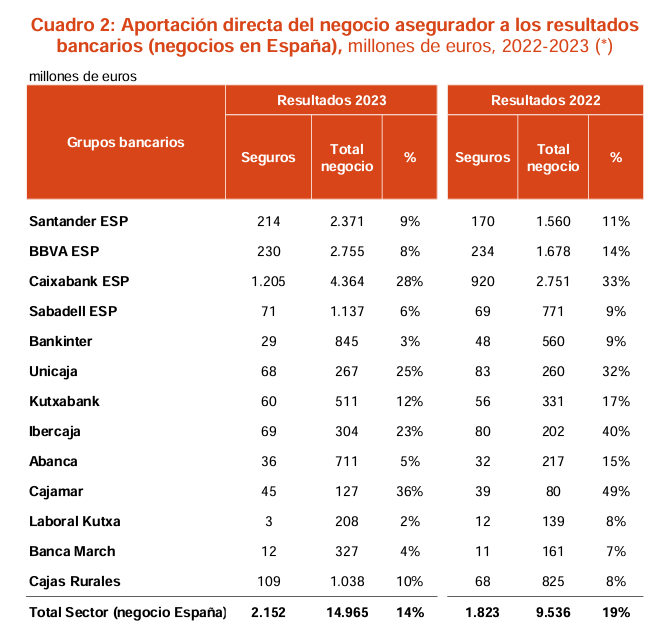 La aportación directa del negocio bancaseguros al resultado obtenido por la banca alcanzó los 2.152 millones de euros por sus actividades en España. Este resultado representaría el 14% del total de sus resultados agregados. Sin embargo, AFI en su último informe, explica que a este dato que se obtiene por las participaciones accionariales en compañías de seguros habría que sumar el margen que generan las comisiones por la distribución de los productos en las redes bancarias.